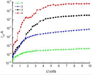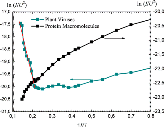 We was reported about a tunneling mechanism to charge transport mesoporous silicon with columnar structure at a number of loaded nanoparticles plant viruses at room temperature under condition of coincidence of the pore size with the smallest viruses of plant [25]. Figure 2 (curve 1) shows the presence of the tunneling current in the adsorption of virus particles only when the applied voltage is greater than 5 V. The tunnel current was defined by the Fowler-Nordheim theory: