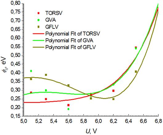 We can find the barrier height, if we will numerically differentiate an experimental data. Figure 4 shows calculations results for barrier height f0 in depending of the applied voltage for the smallest TORSV, GVA, GFLV viral particles. The increase in voltage results in a non-linear increase in the height of the barrier for the investigated virus particles. Thus, viral particles change their electrical properties depending on the applied voltage and have a non-linear response. We can only estimate the effective magnitude of the tunneling barrier, assuming that it is equal to the effective width dv. However, it still requires additional refinements and more detailed studies. The obtained experimental data can be used for identification and characterization of viral particles.