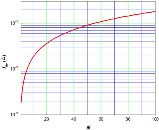 = 5÷25 nm, dielectric thickness d= 2÷5 nm, length L= 100÷500 nm and dielectric constant e =4.5 is in limit 1.2÷27 nF. In the line mode of the DG MOSFET transistor, we can find the number of the adsorbed particles, which can be estimated from the relationship