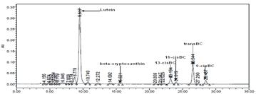 The chromatogram of the most common carotenoids pattern presented in investigated leafy vegetable is shown in fig 1. Two classes of carotenoids namely; xanthophylls and carotenes were identified and quantified under the HPLC conditions used for the research. Carotenoids were eluted in the following order: Lutein, β - cryptoxanthin, 13 – cis β – carotene, 15 –cis β – carotene, trans – β – carotene and 9 – cis - β - carotene.